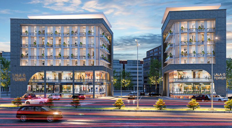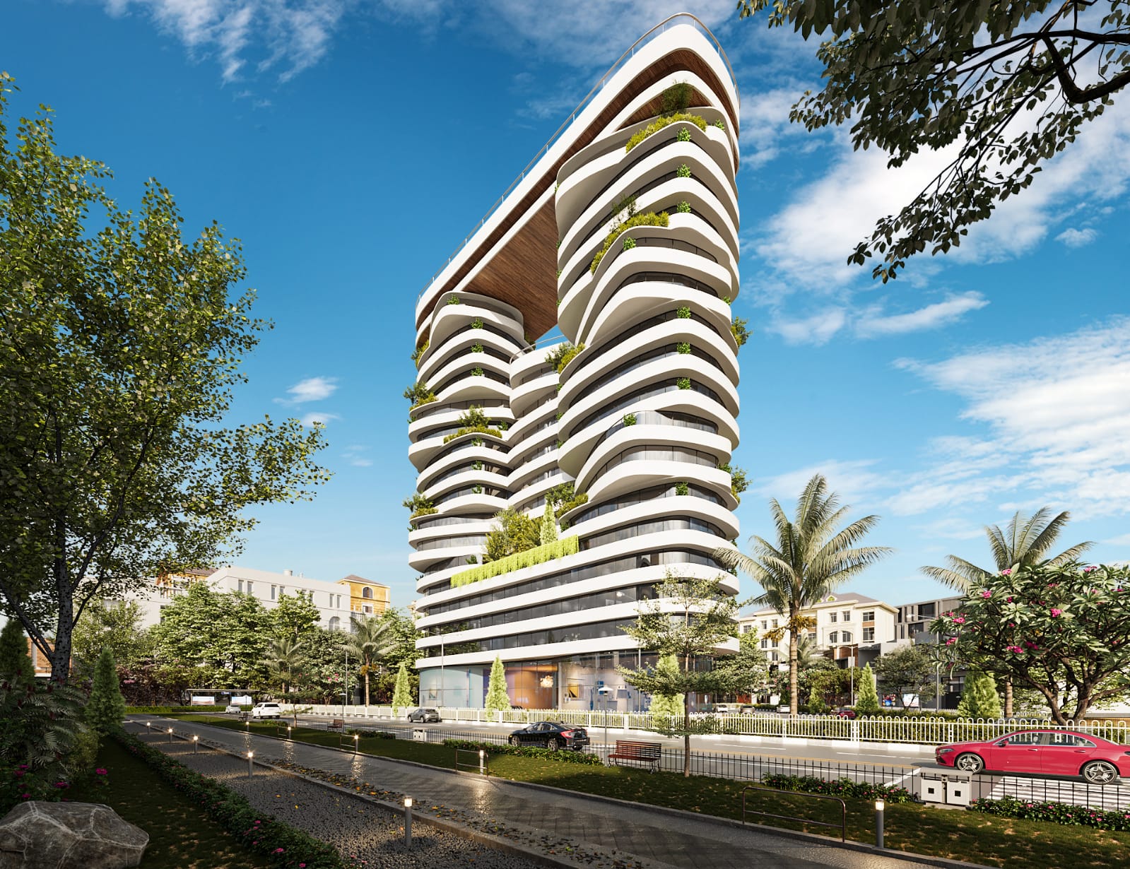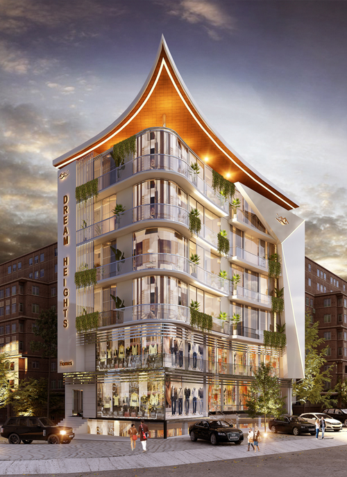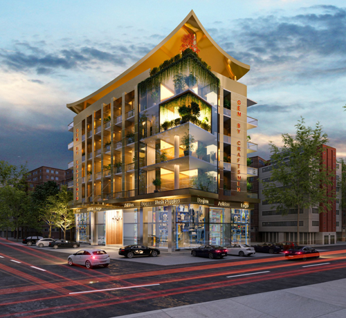 'Gem by Craftsmen,' designed by Maveros, is a stunning embodiment of urban luxury and innovation. Its elegant symmetrical structure is accentuated by vertical lines and expansive glass panels, creating a sense of openness and sophistication. The signature overhanging roof adds a distinctive architectural flair, while integrated greenery on the terraces enhances its eco-friendly appeal. With retail spaces on the lower floors and modern residences above, 'Gem by Craftsmen' offers a seamless fusion of functionality and style, setting a new benchmark for contemporary mixed-use developments.